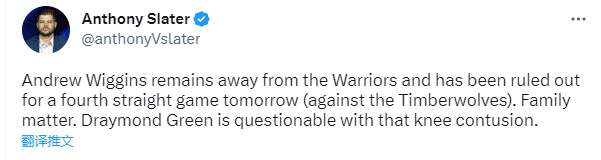 维金斯上一次代表勇士出战是在2月14日,当时勇士战胜奇才,维金斯全场出战39分钟拿到29分7篮板4助攻,之后维金斯因个人原因而请假离开球队,时至今日,维金斯已经离队长达12天,连续缺席与快船、湖人、火箭和森林狼的比赛,仍没有归队日期。