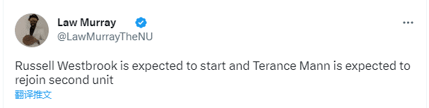 来源:24直播网02-25 12:1824直播网讯02月25日,据快船随队记者Law Murray报道,球队新援威少预计将首发出战,特伦斯-曼恩预计将回到第二阵容;名记揭秘快船签约威少内幕,乔治力排众议获小卡支持。