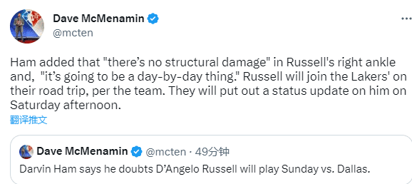 今日,湖人主帅哈姆透露拉塞尔的情况,表示:拉塞尔将大概率缺席下一场与独行侠的比赛,他没有结构性损伤,目前为每日观察状态。