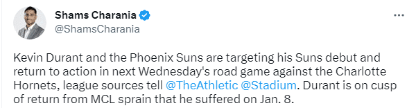 在今年1月9日篮网对阵热火的比赛中,杜兰特不幸被巴特勒误伤,导致右膝内侧副韧带扭伤,因伤缺席至今;到目前为止,杜兰特已经连续缺席18场比赛,未来2战也不会出战,相当于因膝盖扭伤总共伤停52天缺席20场比赛,预计将在3月2日客场对阵黄蜂复出并迎来太阳生涯首秀,这也将是太阳四巨头首次合体的时间。