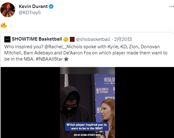 杜兰特转发名记Rachel Nichols在全明星周末期间采访欧文、杜兰特、威廉森、米切尔、阿德巴约和福克斯等人的视频,配上一个“火”表情;究竟是谁启发了你?众星答案来了。