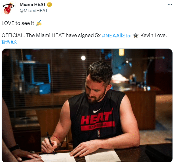热火官方写道:热火正式签下5届全明星凯文-乐福,2016年NBA总冠军,职业生涯场均 17.2分10.5篮板2.3助攻,投篮命中率 43.9%,三分投篮命中率 37.2%。