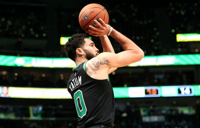 塔图姆第一点5投1中投进花球,之后手感有起伏,第二点5中4,两个超远3分都没进,最后一个点5投全中,首轮总成绩是20分。