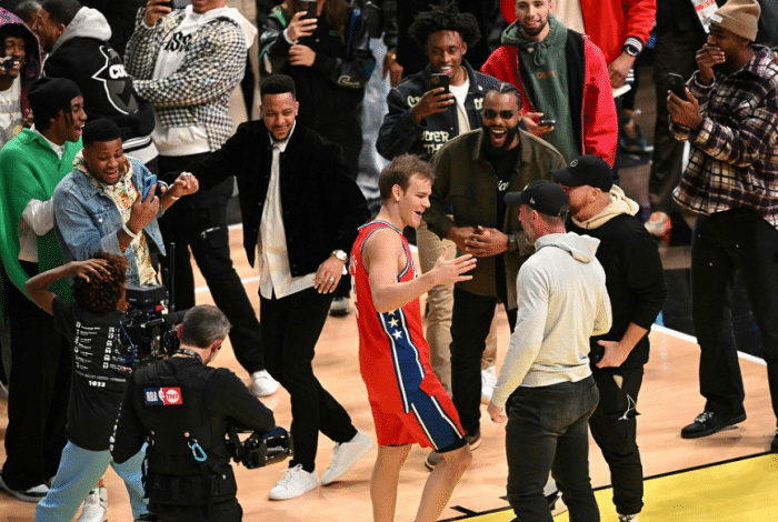 1米88迈克朗上演疯狂一扣,飞跃两人打板反扣点燃球馆,获得评委一致好评,满分50分,字母哥等球星都露出不敢相信的夸张反应;第二扣,迈克朗风车转体双手暴扣,49.8分险些满分。