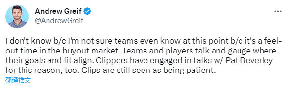据快船记者Andrew Greif报道,快船已经和自由球员贝弗利进行了会面谈判,在买断市场上,这是一个试探性的时间,快船正在寻找合适的引援目标。