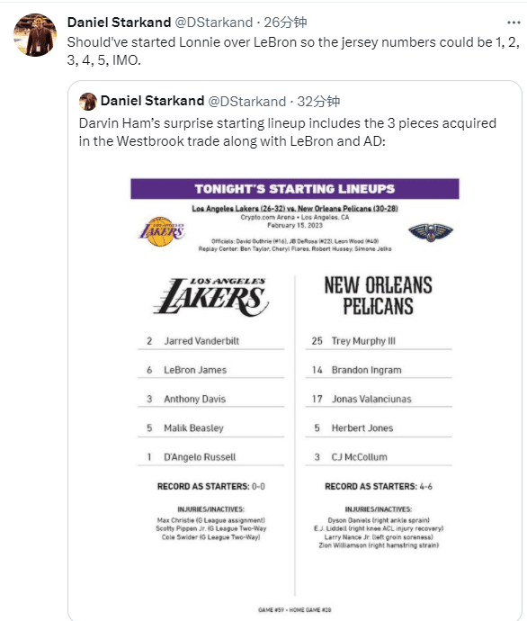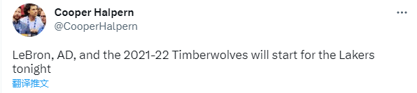 哈姆再次尝试新阵容,美记者调侃詹眉搭档森林狼21-22赛季三大首发一起首发战鹈鹕,还记者调侃应该让朗尼-沃克代替詹姆斯首发,这样湖人就能凑出1、2、3、4、5的首发阵容(数字代表球员的球衣号码)。