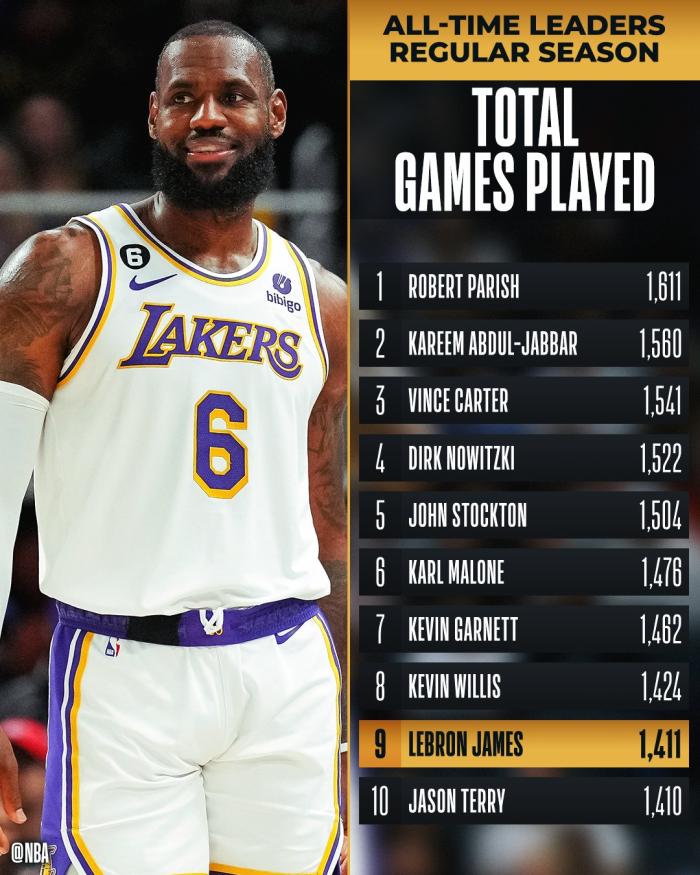 詹姆斯复出战鹈鹕,生涯第1411场出战,正式超越贾森-特里升到历史出场数第9位,目前排在詹姆斯前面的一位是凯文-威利斯(1424场),本赛季有望升到历史第8位。