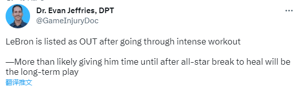 医学专家Evan Jeffies发推表示,詹姆斯经过高强度训练仍缺席比赛,可能他的脚踝需要到全明星周末后才能痊愈,给他更多的休息时间,这是一个长期决定。