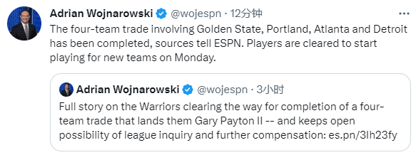 勇士把怀斯曼送到活塞,2个次轮签送到开拓者,最终得到小佩顿;老鹰送走三个次轮签,最终得到萨迪克-贝;活塞送走诺克斯和萨迪克-贝得到怀斯曼;开拓者送走小佩顿,最终得到5个次轮签和诺克斯