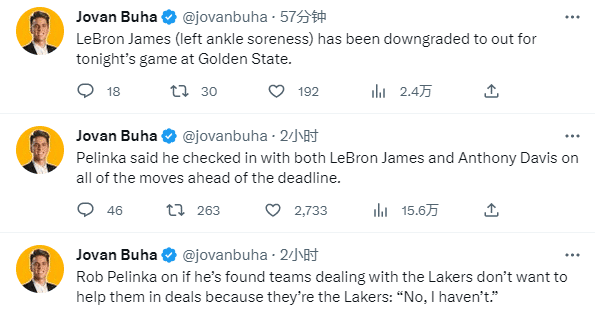 名记克里斯-海耶斯报道:我被告知,在詹姆斯打破贾巴尔纪录之夜的那场比赛中,詹姆斯的脚伤很严重,伤势已经到了无法忍受的程度,但他还是坚持下来了。据说他的脚伤让他非常挣扎,包括脚的每一面都感觉到疼痛。他的脚伤可能会贯穿整个赛季,而且是已经到了可怕的地步。在此前对阵雄鹿的比赛他因脚踝伤势休战了,而不是脚伤,但詹姆斯的脚伤可能要花一整个赛季的时间来解决。