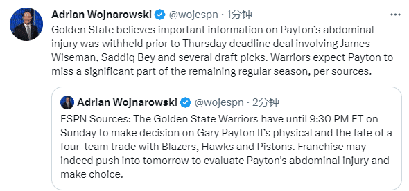 四方交易闹剧后续:勇士最晚明天做决定 佩顿伤病被隐瞒预计缺席很久