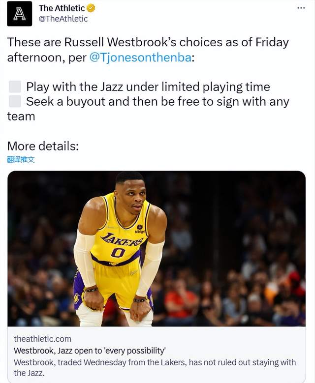 根据报道,爵士方面对于和威少的友好沟通感到非常高兴,对于威少的职业精神也感到开心。威少将决定自己在下半个赛季的未来,而且爵士不会给威少设限。这意味着,威少可以选择和爵士达成买断协议,然后加盟自己心仪的球队。当然,威少也可以选择留在爵士,如果这样选择,爵士不会裁掉威少,并且很高兴看到他留在阵容名单中。