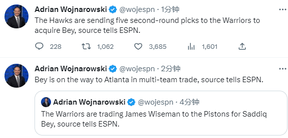 来源:24直播网02-10 16:3424直播网讯02月10日,NBA交易截止日前,勇士、老鹰和活塞达成一笔三方交易,据名记woj报道,勇士把榜眼怀斯曼交易到活塞,从老鹰得到五个次轮签,活塞把萨迪克-贝送到老鹰。