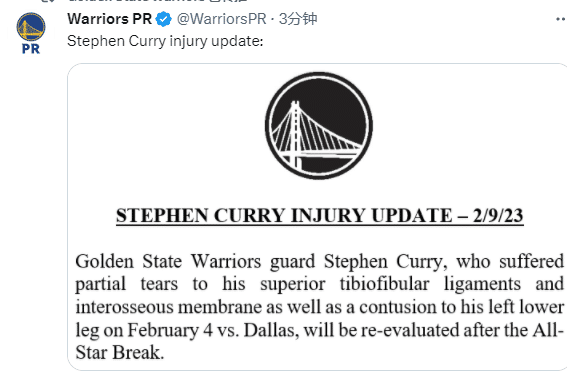 勇士交易怀斯曼后更新库里的伤情,宣布库里因左胫腓上韧带和骨间膜部分撕裂和左小腿挫伤,将在全明星周末后接受复出,相当于官宣库里因伤无缘盐湖城全明星赛。