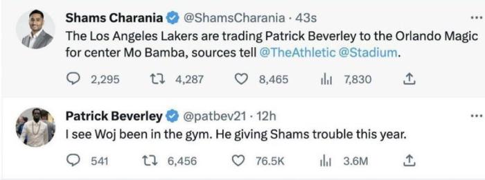 贝弗利被湖人交易到魔术,预计会被买断,多支季后赛球队想要他;值得一提的是,威少被交易后,贝弗利第一时间欢迎拉塞尔加盟湖人,然后贝弗利在交易截止日看热闹,调侃shams和woj两大名记,结果仅仅过了12个小时,贝弗利就被交易了。