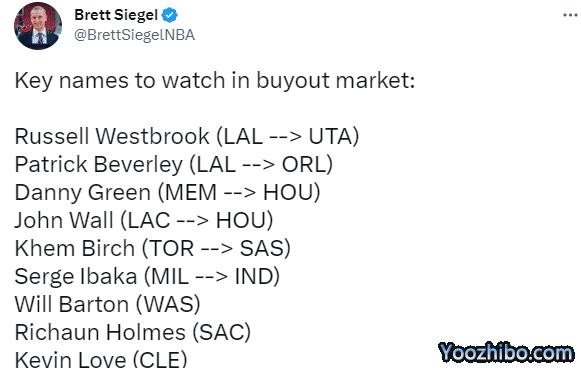 NBA记者Brett Siegel列出买断市场中值得关注的潜在人选名单:威少(被湖人送至爵士)、贝弗利(被湖人送至魔术)、丹尼-格林(被灰熊送至火箭)、沃尔(被灰熊送至火箭)、伯奇(被猛龙送至马刺)、伊巴卡(被雄鹿送至步行者)、威尔-巴顿(奇才)、霍姆斯(国王)。