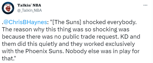 名记Chris Haynes报道,太阳队的操作震惊了所有人,这件事之所以如此令人震惊,是因为杜兰特的离队请求没有公开,杜兰特和他们悄悄地促成了交易,他们专门与菲尼克斯太阳队合作,没有其他球队参与其中。
