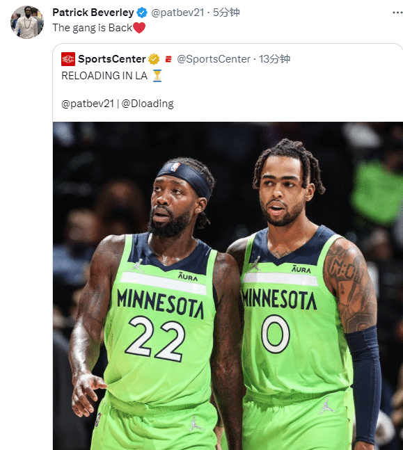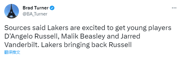 拉塞尔重返洛杉矶,与贝弗利重聚,湖人球员贝弗利第一时间发推欢迎拉塞尔,发推:二人帮回来了;据报道,湖人对4换3送走威少引援拉塞尔、范德比尔特和比斯利感到很兴奋。