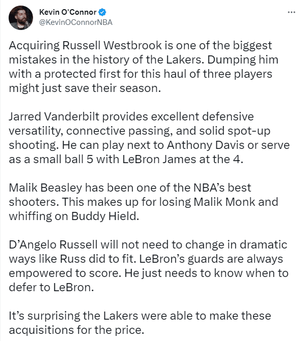 另一名记Kevin Oconnor发推:湖人引援威少是湖人队史最大失误之一,现在搭上一个首轮就送走他,范德比尔特能够提供出色防守和扎实的定点投篮,他可以和詹姆斯、浓眉一起上场;比斯利是NBA最佳射手之一,弥补球队的缺陷,拉塞尔能够得分,但他需要听从詹姆斯的,湖人能够达成如此交易令人惊讶。