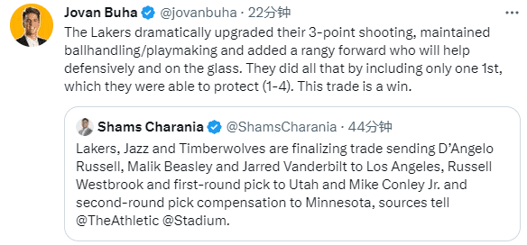 湖人4换3送走威少引热议,湖人随队记者Jovan Buha发推评价道:湖人戏剧性地忽然提升了球队的三分命中率,而且还保住了持球点和组织能力。此外还得到了一位有远程火力、防守和护筐的前锋。得到这所有一切只付出了一个首轮签,而且是1-4顺位保护。这笔交易就是一场胜利!