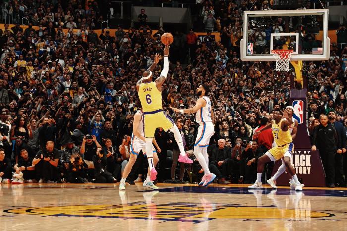 詹姆斯破纪录后湖人失误不断,老詹末节仅仅拿到2分,比赛还剩37.7秒湖人仅落后6分,詹姆斯提前放弃比赛,坐在替补席并且解开鞋带,最终湖人输掉比赛,赛后詹姆斯满脸笑容,接受采访时,詹姆斯表示:我知道我还能打好几年,即使在这个年龄,我也能帮任何一支球队赢得多个总冠军。