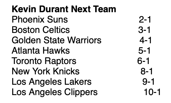 究竟杜兰特是否会在交易截止日前申请离队?杜兰特下家最新赔率出炉,太阳1赔2领跑,凯尔特人1赔3,勇士1赔4,老鹰1赔5,猛龙1赔6,尼克斯1赔8,湖人1赔9和快船1赔10;不过名记扎克-洛维表示杜兰特不太可能在截止日前申请交易,否则全联盟都会震惊。