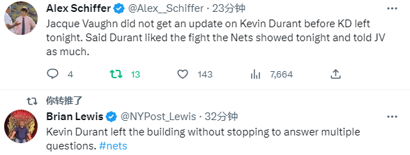 赛后谈到杜兰特的情况,沃恩表示:杜兰特在离开球馆前告诉我他喜欢球队今晚的战斗精神,但关于他的伤情还没有任何更新。