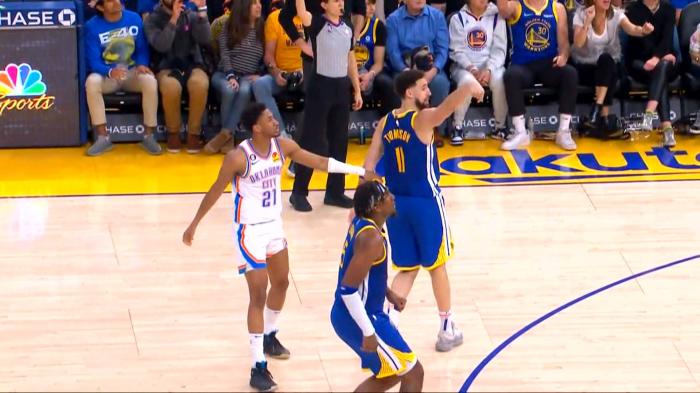 第二节,汤普森外线继续开炮,单节又投进3记三分,上半场最后时刻,汤普森更是迎着防守轰进撤步压哨三分,如此极限操作点燃球馆;汤普森半场投进7记三分独砍27分,勇士第二节拉开分差,半场打完勇士反超7分。