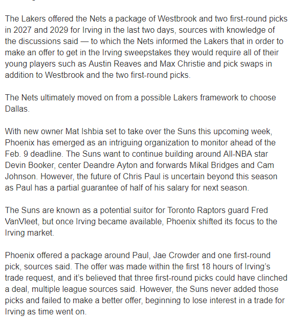 太阳向篮网报价保罗、克劳德和一个首轮选秀权,太阳在欧文提出交易请求的18个小时后就提出这样的报价,但篮网想要三个首轮签,最终太阳没有加价,并且对欧文失去兴趣,预计未来几天,太阳将在交易市场上会很活跃,保罗可能被交易,太阳正在追求范弗利特。