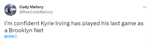篮网记者CodyMallory更是发推写道:我相信凯里-欧文已经打完了他作为篮网球员的最后一场比赛。