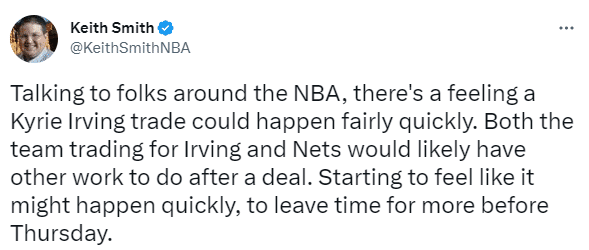 篮网宣布欧文缺席比赛引热议,NBA记者KeithSmith报道,跟一些NBA相关的人士谈过,感觉欧文的交易应该很快发生。交易到欧文的球队以及篮网在处理完此交易后还有其他的工作需要做。所以感觉交易很快会发生,在交易截止日之前留出更多时间。