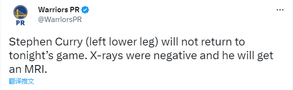 勇士官宣库里伤退:小腿被撞伤一瘸一拐离场 初步检查结果出炉