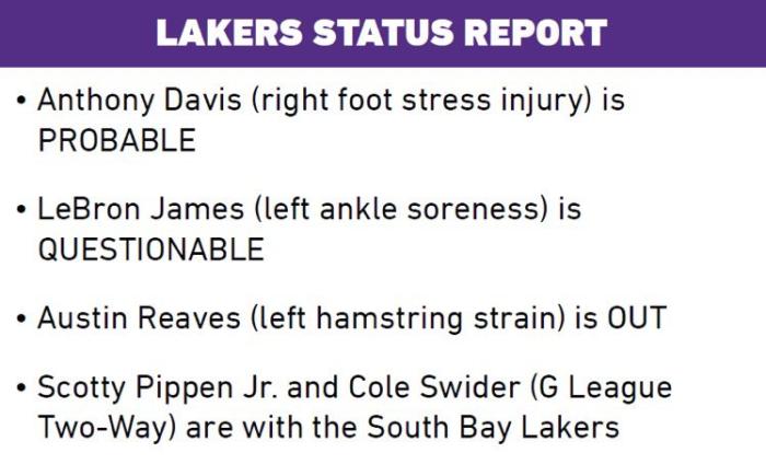 来源:24直播网02-04 16:1924直播网02月04日讯 ,湖人官方公布下一场对阵鹈鹕的伤病报告,浓眉(右脚应激反应)大概率出战,詹姆斯(左脚踝酸痛)出战成疑;里夫斯(左腿筋拉伤)、小皮蓬(发展联盟)和斯威德(发展联盟)继续缺席比赛。
