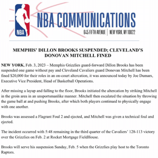 NBA官宣冲突罚单:灰熊恶汉下黑手被禁赛1场 米切尔被罚2万美元