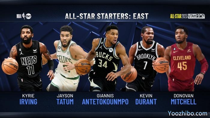 东部全明星首发:字母哥(队长)、杜兰特、塔图姆、欧文、米切尔。