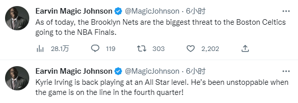 魔术师发推写道:截至今天,篮网是凯尔特人队进入NBA总决赛的最大威胁。”“凯里-欧文重返全明星级别。当比赛打到第四节关键时刻,他势不可挡。”