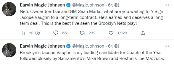 来源:24直播网01-12 10:2724直播网01月12日讯 ,湖人名宿魔术师约翰逊发推谈到篮网现状,表示篮网是凯尔特人进入总决赛的最大威胁,盛赞欧文并且呼吁篮网赶紧续约主帅沃恩。