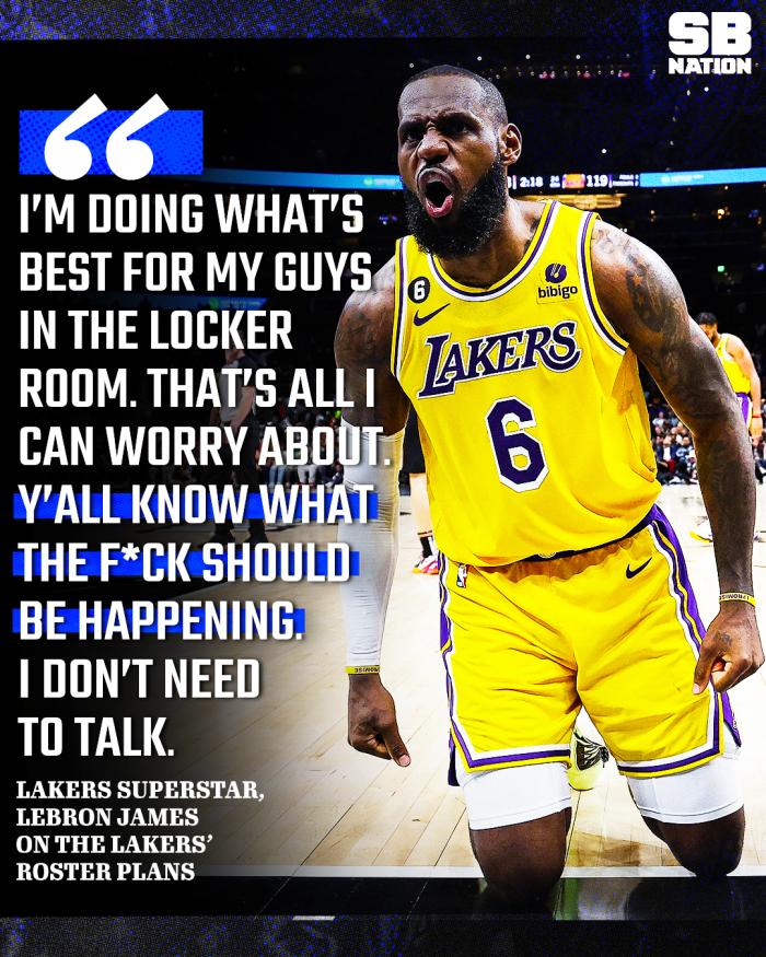 谈到湖人本赛季的交易话题,詹姆斯表示:听好了,我是打球的,操心的是更衣室里的人。我不能——这不是我的工作,我不能去做别人的工作。