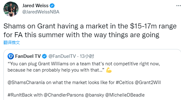 名记Shams在节目中表示:格威明夏能够获得一份年薪1500万-1700万美元的合同,看看明年夏天有薪资空间的球队,魔术、雷霆、步行者。这些目前缺乏竞争力的球队可以尝试报价格威。他能为这些球队提供领导力,也能在场上为他们提供帮助。