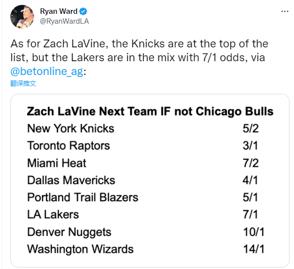 拉文下家最新赔率显示,若拉文离开公牛,尼克斯是拉文最可能加盟的球队,紧随其后的是猛龙(1赔3)、热火(2赔7)、独行侠(1赔4)、开拓者(1赔5)、湖人(1赔7)、掘金(1赔10)和奇才(1赔14)。