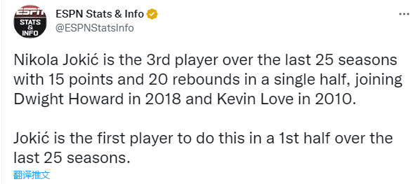 1、约基奇成为NBA过去25年第三位半场至少拿到15分20篮板的球员,之前两位分别是2018年的霍华德和2010年的乐福