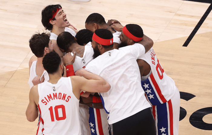欧文绝杀后,杜兰特第一时间冲过去,紧紧抱住欧文;西蒙斯、乔哈、奥尼尔、克拉克斯顿等队友也跑过去,围着欧文疯狂庆祝,杜兰特搂着欧文,后者趴在KD的怀抱里。