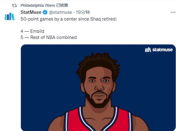 11、恩比德在奥尼尔退役后4次拿到50+,自此之后,联盟其他所有中锋加起来只有5次
