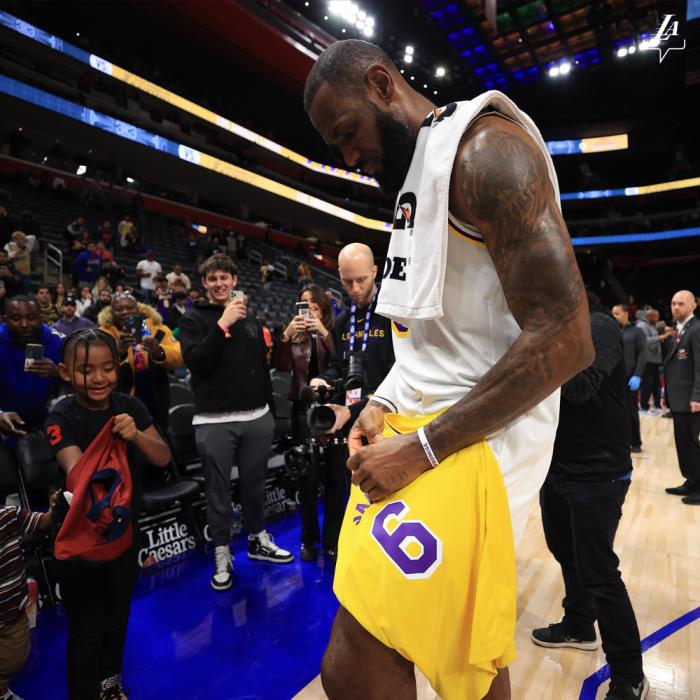 赛后詹姆斯为场边的小球迷签名,还为小球迷穿上球衣,结束六连客(3胜3负),湖人终于可以重返洛杉矶了。詹姆斯全场拿到35分5篮板5助攻,职业生涯第515次单场轰下30+,仅次于乔丹排在历史第二位;詹姆斯(37岁346天)还打破一项队史最年老纪录,超越贾巴尔(37岁267天)成为湖人队史单场至少35+5+5最老球员。