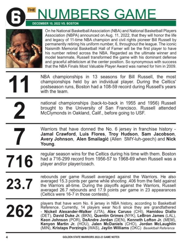 比尔-拉塞尔在NBA打了13个赛季,11次夺得总冠军,被誉为“指环王”,职业生涯对阵勇士场均拿到15.3分2.33.7篮板;拉塞尔离世后NBA联盟宣布所有球队都将永久退役6号球衣(现役穿6号的球员都可以继续穿6号,但不会有新的球员再穿6号)。
