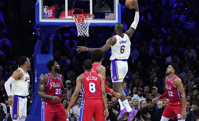 常规时间最后1分钟以内,梅尔顿大空位三分球命中,76人领先湖人8分,还剩下34.8秒,恩比德两罚中一,湖人落后9分;
