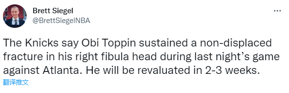 尼克斯官方宣布,托平的右腓骨遭到非移位性的骨折,球队将在2-3周内对伤势进行重新评估;托平是在尼克斯与老鹰比赛中受伤的,因伤提前退出比赛。