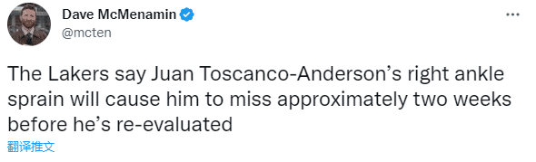 湖人官方宣布,球队前锋托斯卡诺-安德森因遭到右脚踝扭伤,将因伤至少缺席2周,之后他将会对伤势进行重新评估。