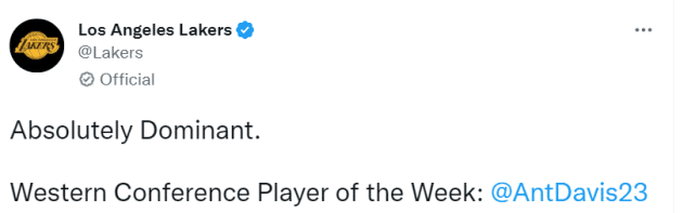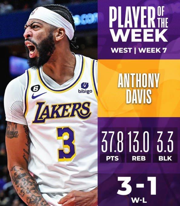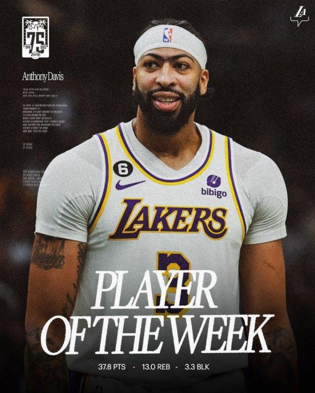 上周,湖人打出3胜1负的战绩,浓眉场均贡献37.8分13篮板3.3盖帽,湖人官方晒图祝贺浓眉当选周最佳:绝对的统治力!