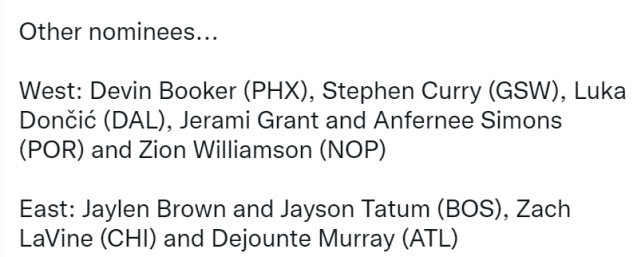 来源:24直播网12-06 22:2924直播网12月06日,NBA官方宣布了第7周的东西部周最佳球员。篮网的杜兰特当选东部周最佳球员,这是他本赛季第二次当选周最佳,生涯第31次获此殊荣。湖人的浓眉当选西部周最佳球员,这是他本赛季首次当选周最佳,也是生涯第8次当选周最佳,上一次当选已经要追溯到2019年12月了。库里、东契奇等球星获得提名。